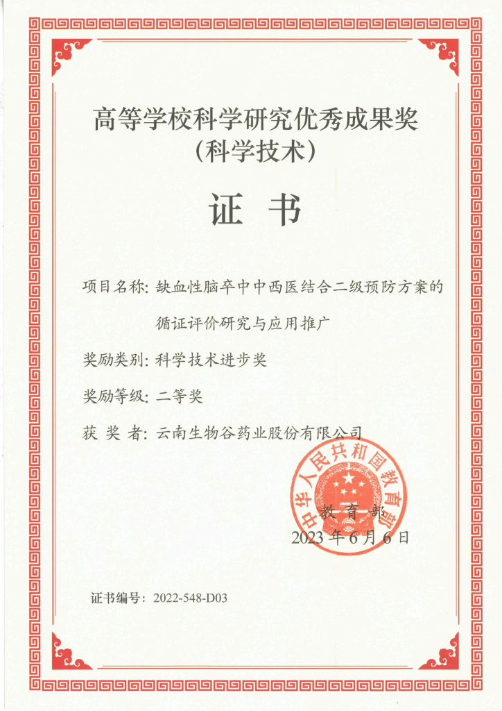 近日,2022年度國(guó)家高等學(xué)??茖W(xué)研究?jī)?yōu)秀成果獎(jiǎng)(科學(xué)技術(shù))獎(jiǎng)項(xiàng)評(píng)定頒布,由廣州中醫(yī)藥大學(xué)牽頭、云南生物谷藥業(yè)股份有限公司聯(lián)合共同完成的“缺血性腦卒中中西醫(yī)結(jié)合二級(jí)預(yù)防方案的循證評(píng)價(jià)研究與應(yīng)用推廣”項(xiàng)目榮獲國(guó)家教育部科學(xué)技術(shù)進(jìn)步獎(jiǎng)二等獎(jiǎng),這是本年度廣州中醫(yī)藥大學(xué)唯一牽頭獲得該獎(jiǎng)項(xiàng)的項(xiàng)目,也是我公司首度與高??蒲袡C(jī)構(gòu)研發(fā)合作獲得教育部重大獎(jiǎng)項(xiàng)。